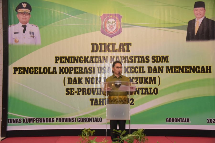 Penjagub Hamka Hendra Noer saat menyamatkan kartu tanda peserta Diklat SDM Pengelola Koperasi yang berlangsung di Hotel Grand Q, Kota Gorontalo, Jumat …