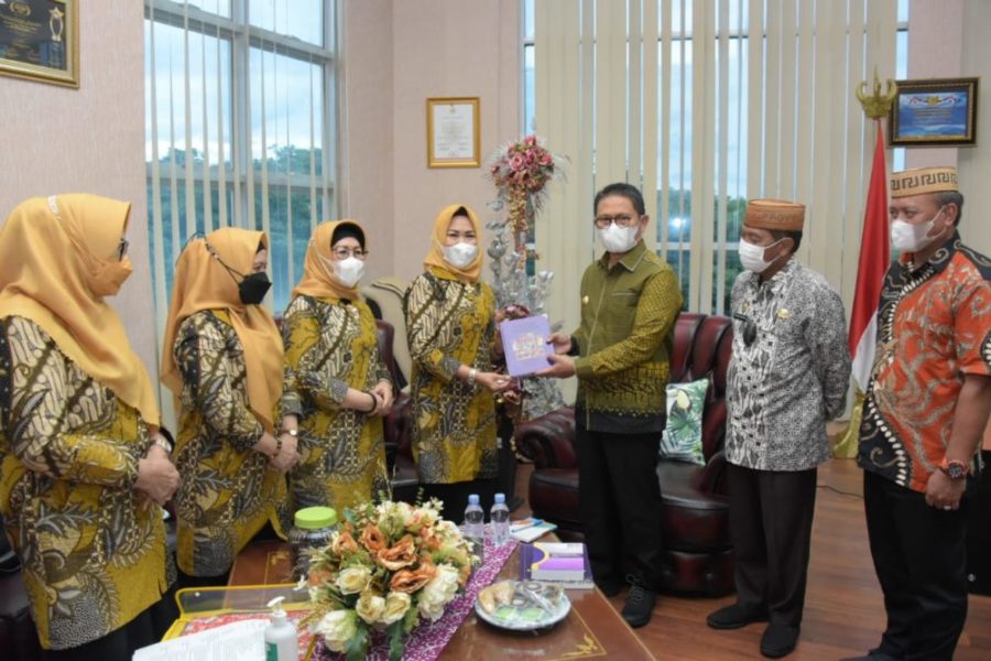 Ketua BKOW Provinsi Gorontalo Nurindah Rahim bersama jajarannya saat menyerahkan beberapa hasil karya BKOW kepada Penjagub Gorontalo …
