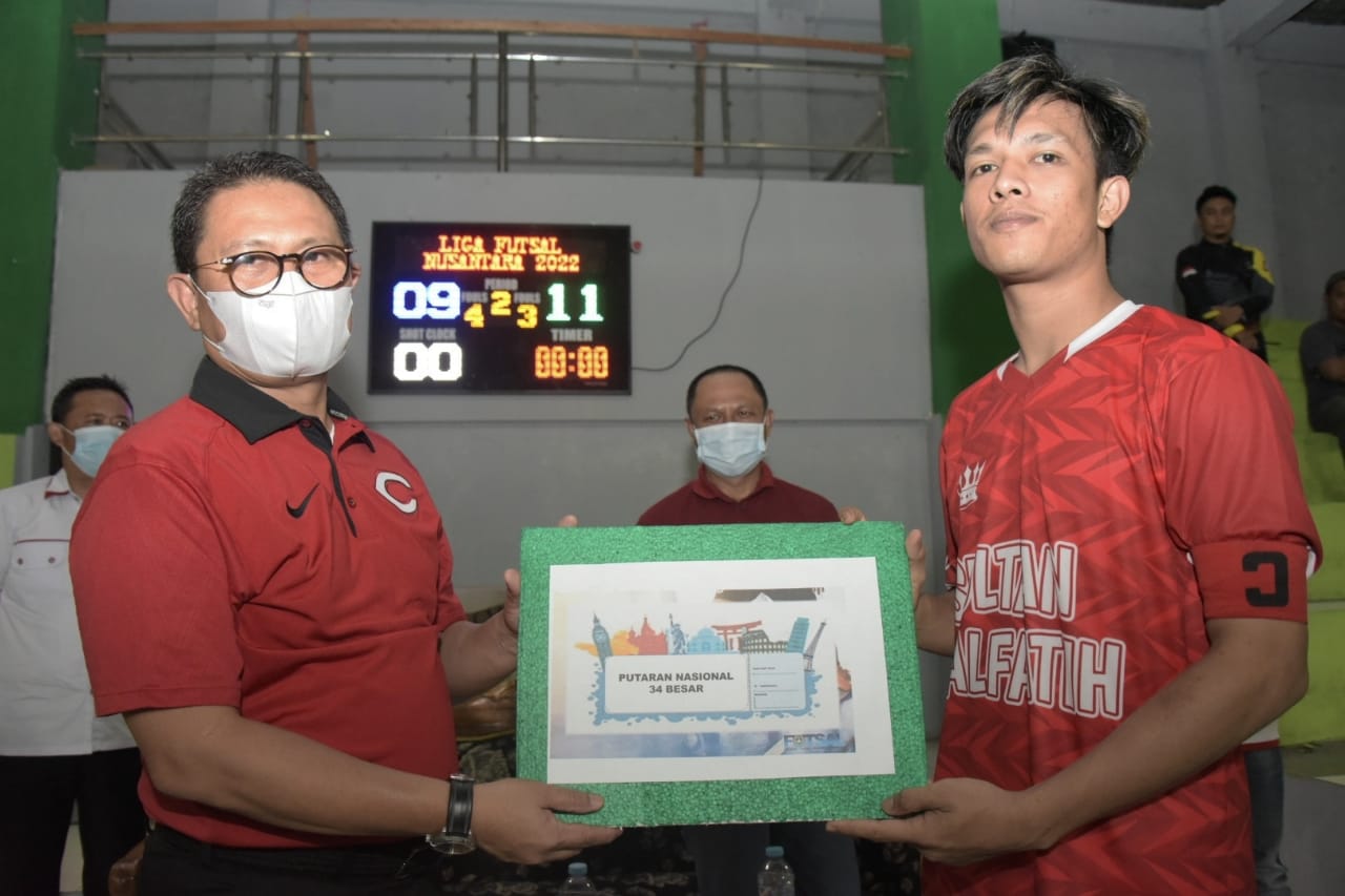 Penjagub Gorontalo Hamka Hendra Noer (tengah kaos merah) foto bersama dengan tim futsal pada penutupan LFN 2022 Rayon Gorontalo yang berlangsung di …